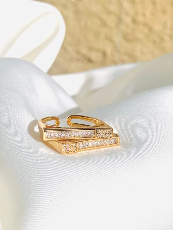 Son design est net, graphique, moderne. Deux barres parallèles serties de strass brillants, finement alignés, qui jouent avec la lumière à chaque mouvement. C’est un bijou qui capte le regard tout en restant chic, propre, épuré. Pas de fioritures, pas d’extravagance, juste ce qu’il faut pour affirmer ton style avec une vraie touche rock.