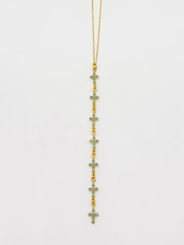 La chaîne fine en plaqué or apporte légèreté et raffinement, tandis que la succession de croix crée un mouvement harmonieux et lumineux. Porté sur peau nue, sur un top échancré ou une chemise légèrement ouverte, il devient immédiatement la pièce centrale du look.