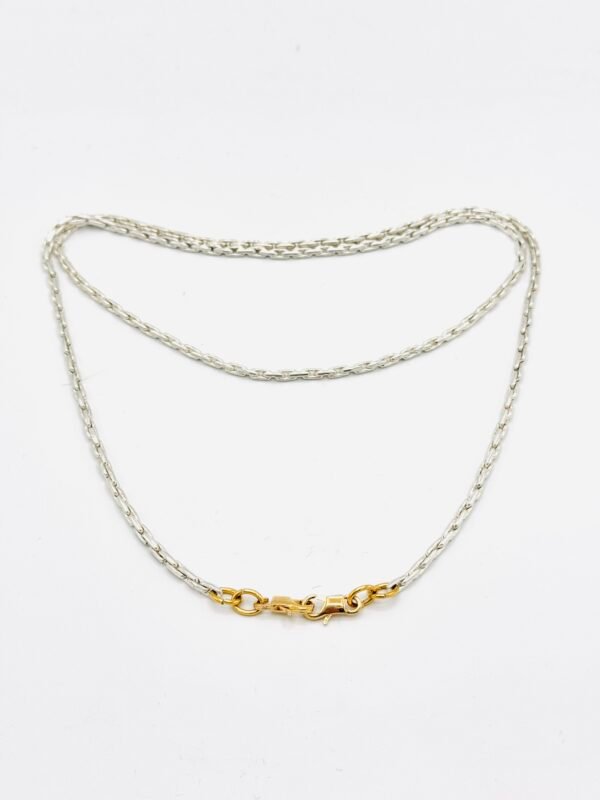 Chaîne fine argentée et fermoir doré, un mix subtil et rock.