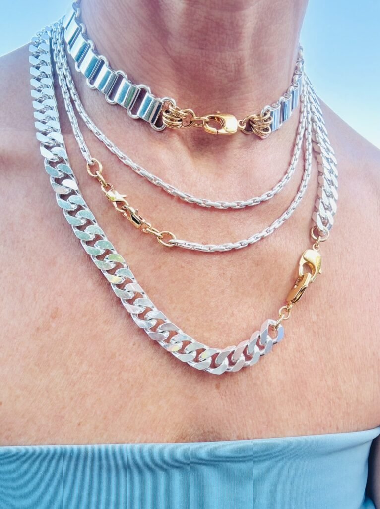 Collier Joni – Princess To LendLe collier signature qui mixe argent et doré pour un style chic et rock. Design en maillons rectangulaires argentés Fermoir mousqueton doré XL, élément mode à part entière Unisexe, porté aussi bien par les femmes que par les hommes À porter seul ou en accumulation avec d’autres colliers Style chic, rock et intemporel, 100% Princess To Lend