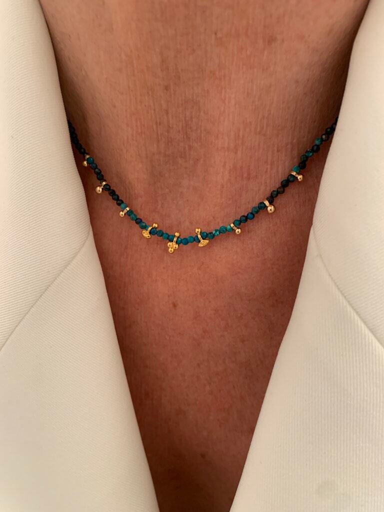 Bijou talisman chic et énergétique Pierres naturelles et plaqué or Longueur : 38 cm + 3 cm d’extension Disponible en Turquoise, Chrysoprase, Agate, Azurite, Pietersite Fait main avec soin À porter seul ou en accumulation – Princess To Lend style